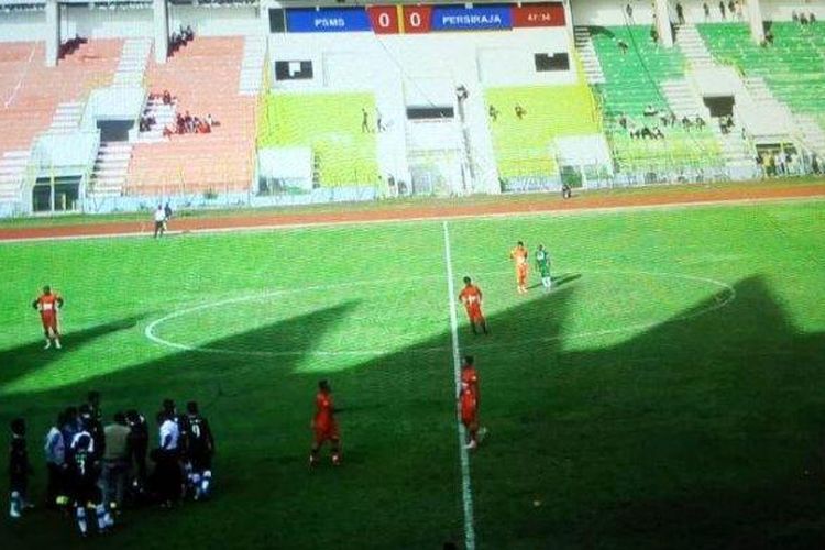Laga uji coba antara Persiraja Banda Aceh melawan PSMS Medan terpaksa dihentikan usai stadion dimasuki oleh penonton.